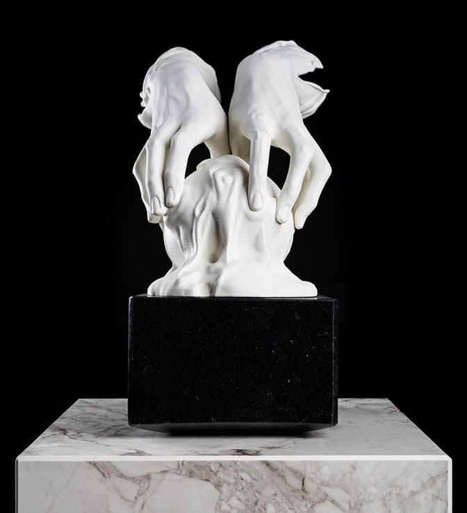 Comme son titre l’indique, « Genesis » est une sculpture représentant le processus de création. Pour la réaliser, l’artiste s’est référé au motif de la création du monde, qui est populaire dans l’art depuis des siècles. Sur un socle noir se trouve une sphère dégoulinant d’une substance liquide, formée par deux mains qui la surplombent. Malgré la matière première utilisée, l’œuvre surprend par son incroyable douceur : des mains délicates aux longs doigts blancs se fondent dans le liquide, qui s’écoule doucement vers le bas. Cette œuvre exceptionnelle attire l’attention par son élégance, sa beauté classique, mais surtout par son excellente facture.