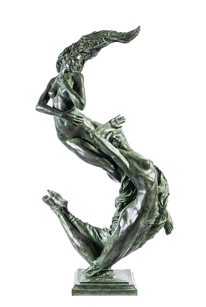 The “Message Sensuel” sculpture depicts two naked women. Their bodies are casually entwined – they intertwine with each other, in an almost unnatural twist to form the letter S. The arrangement of the figures alludes to the « Figura serpentinata » popular in Italian Mannerism. The spiral connection of the bodies gives the work a dynamic and lightness, while at the same time making it escape traditional perception. The women’s bodies, slender and graceful, allude to ancient canons of beauty with their structure. Siudmak sets the matter in motion in an illusory way, and the bronze figures become almost alive – the sensual human silhouettes, kept in the colors of sea green, seem to gently move and glide through the air.